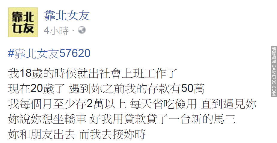 靠北女友原文:#靠北女友57620 我18歲的時候就出社會上班工作了 現在20歲了 遇到妳之前我的存款有50萬 我每個月至少存2萬以上 每天省吃儉用 直到遇見妳 妳說妳想坐轎車 好我用貸款貸了一台新的馬三 妳和