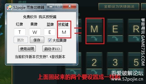 設置方法看圖,這次就懶得上遊戲測試圖了 默認切牌鍵是W黃牌,E藍牌,T紅牌,可以自己改成順手的。 支持全屏全分辨率,是內存讀牌不是找圖色的,所以不支持全版本,只支持7.4版本。 這版本加入了大招黃牌和自
