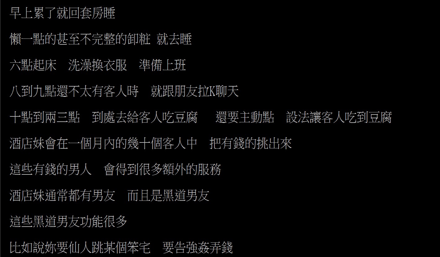 作者 mmc109815038 () 看板 Gossiping 標題 Re: [問卦] 酒店妹妹的一天是怎麼度過?! 時間 Sat Jul 16 01:29:45 2016 ─────────────────────────────────────── ※ 引