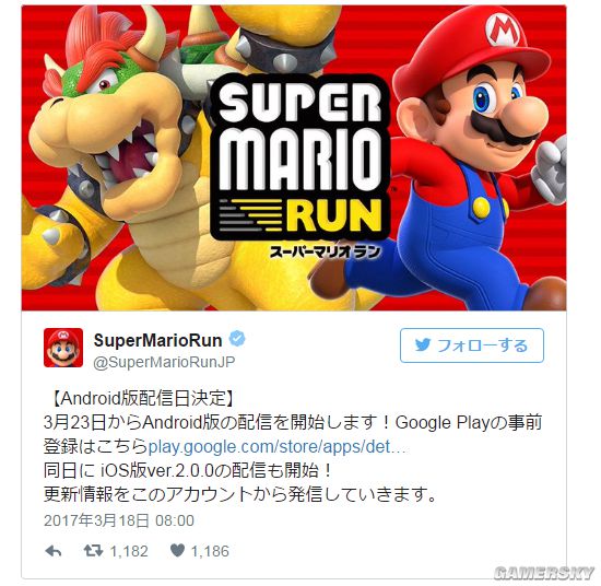 《超級馬里奧奔跑》官方在推特上宣佈,遊戲安卓版將於2017年3月23日正式推出。 而在3月23日,iOS版的遊戲也將更新到2.0.0版本,完成特定難度將免費解鎖關卡1-4。