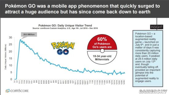 根據調查網站comScore的報告,於2016年7月6日面世的現象級手機遊戲《精靈寶可夢:GO》,在推出後半年日活躍用戶大跌80%!