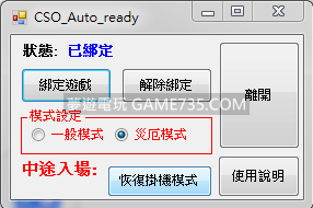 小弟是初學者 試著寫了CSO自動準備~ 如果怕有毒就別載囉.. 點我下載 說明: 1.請先執行遊戲設定遊戲影像為 'OpenGL' 解析度為1024x768 視窗化,重開遊戲! 2.執行遊戲換好刀進入房間後,選擇模式再執行綁定遊戲~