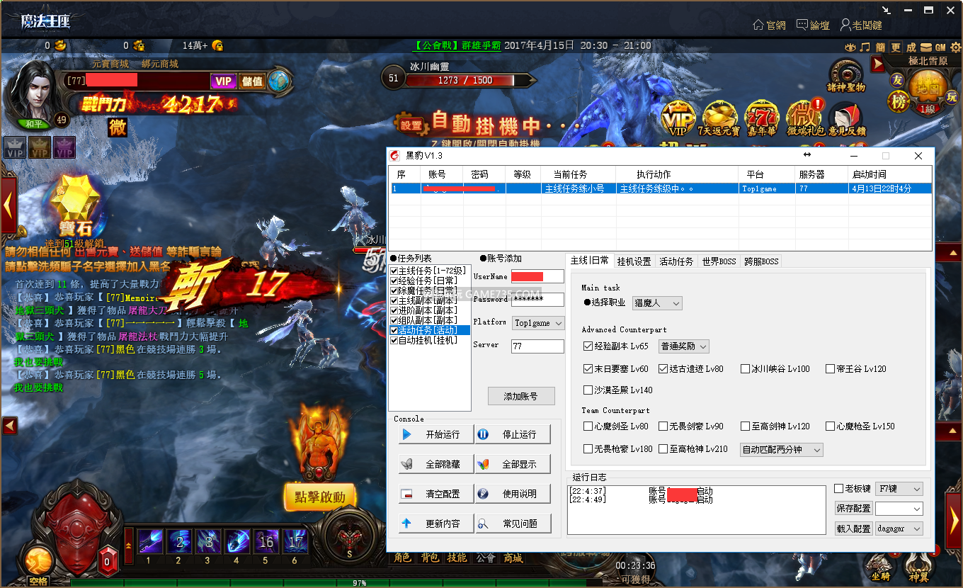 《輔助名稱》 魔法王座外掛-黑豹魔法王座 《更新內容》 V0430 新推出,請測試看看 《黑豹魔法王座-一日卡領用》 http://wg8591.com/plugin.php?id=yxhf_597youxi:fh&fid=17 《黑豹魔法王座-使用說明》 待增加