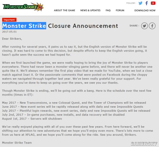《怪物彈珠》官方正式在官網發佈公告,稱由於遊戲的運營情況未達預期,英文版本即將停服,遊戲會在接下來的幾個月逐漸關閉各項功能和服務,最終在8月關閉服務器。 遊戲內畫面 遊戲的停服計畫如下: 2017年5