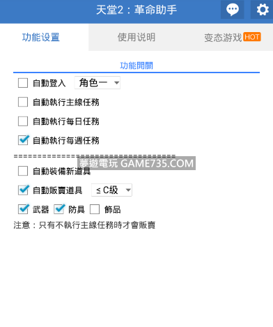 replyreload += ',' + 2095735; 更新內容: 1、增加自動販賣裝備的功能。非自動主線情況下,10分鐘執行一次。 2、新增斷線重連功能。 其餘功能不斷添加中,敬請期待... 下載 所有站內附件皆會附上安全掃描報