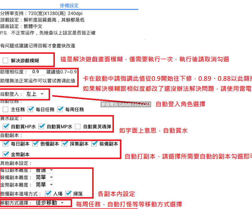 replyreload += ',' + 2097284; 使用前須知: 1、分辨率僅支援720*1280 dpi320。如果手機分辨率不支持,請用模擬器進行掛機。 2、安裝外掛時提示已阻止安裝,請取消手機中的驗證應用即可。 3、推薦雷電模擬器,程式