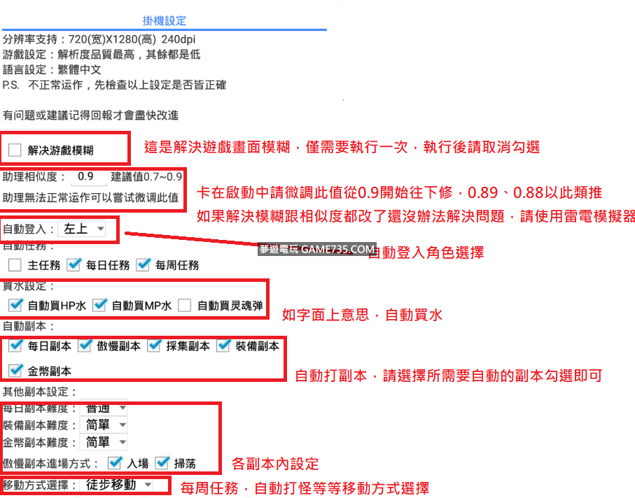 replyreload += ',' + 2097517; 使用前須知: 1、分辨率僅支援720*1280 dpi320。如果手機分辨率不支持,請用模擬器進行掛機。 2、安裝外掛時提示已阻止安裝,請取消手機中的驗證應用即可。 3、推薦雷電模擬器,程式