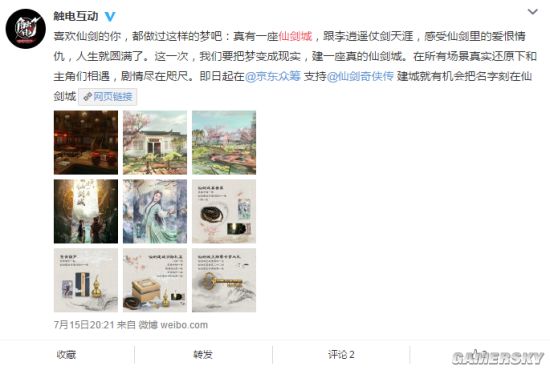 《仙劍奇俠傳》官方目前與觸電開啟了合作,將會在北京建立起一座「仙劍城」,除了官方的出資出力外,他們也開啟了眾籌活動,希望能夠獲得來自玩家們的支持,官方也在眾籌界面給出了本次活動的詳細說明。 據悉,
