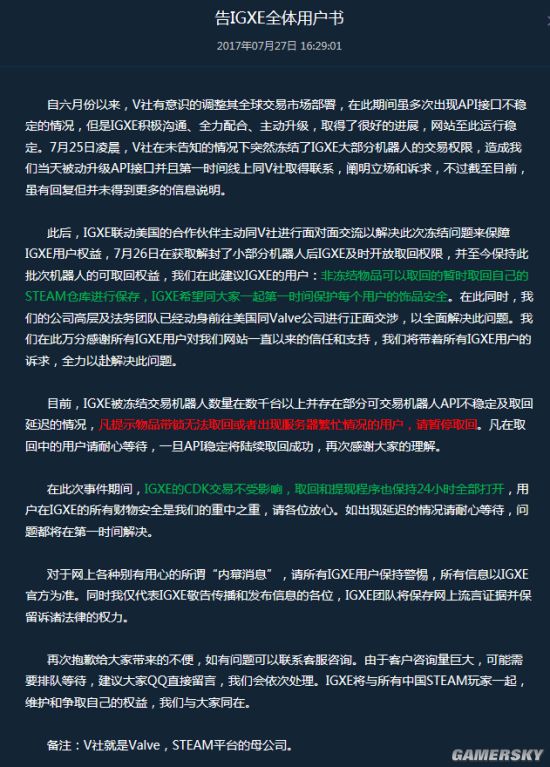 IGXE是一家Steam競技遊戲飾品交易平台,提供《CS:GO》、《Dota2》、《絕地求生》等多個Steam遊戲的相關皮膚、飾品、道具的交易。不過該平台今天發佈消息,稱V社在未曾通知的情況下,突然凍結了IGXE的大部分交易機器