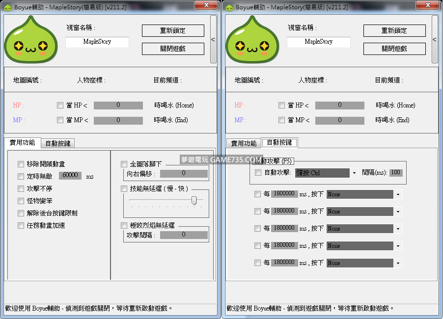 replyreload += ',' + 2099469;程式名稱 Boyue輔助 - MapleStory v211.2 功能介紹 移除開頭動畫 : 就是移除開頭的動畫 定時無敵 : 指定毫秒內無敵 , 設定0 = 連撞 , 對!就是那個Pointer別懷疑 攻擊不停 : 就
