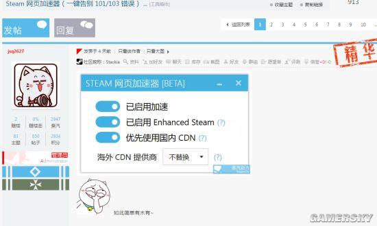 這段時間,Steam的101、103問題很惱人,之前曾有Steamcn論壇「羽翼城」發佈過一款專修工具,用以解決該問題。現在Steamcn論壇用戶jsq2627也發佈了一款「Steam網頁加速器」。