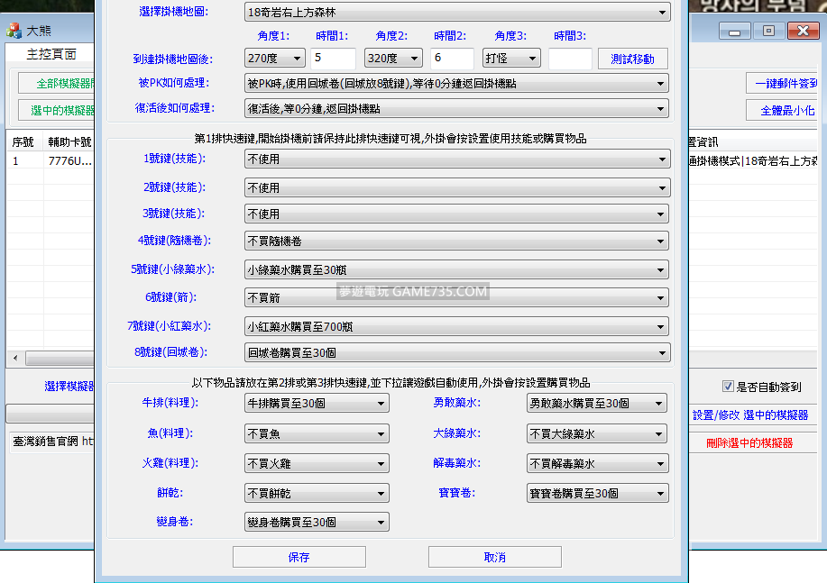 更新0830版,下面發放10組試用序號,若有使用上困難,可至程式上大熊論壇查看詳細使用教學 特點:1.更新快、穩定度高、絕非一般按鍵精靈腳本 2.獨家野圖循環掛機,無水箭時會自動回村買水再至練功點打怪。 3.獨家自動
