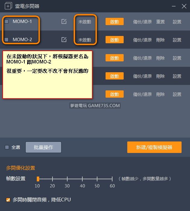 免費版僅能使用正式版的協助模式,並且無自動重新啟動天堂m的功能 直接下載程式就可以用,免費版不需使用正式版試用卡 使用教學 1.先用多開器將模擬器改名為MOMO-1 跟 MOMO-2