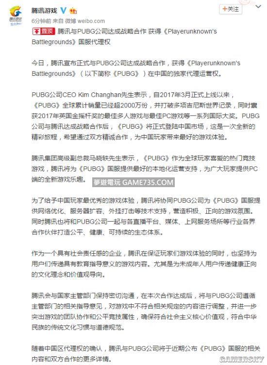 今日,騰訊宣布正式與PUBG公司達成戰略合作,獲得《Playerunknown's Battlegrounds》(以下簡稱《PUBG》)在中國的獨家代理運營權。 PUBG公司CEO Kim Changhan先生表示,自2017年3月正式上線以來,《PUBG》全球累計