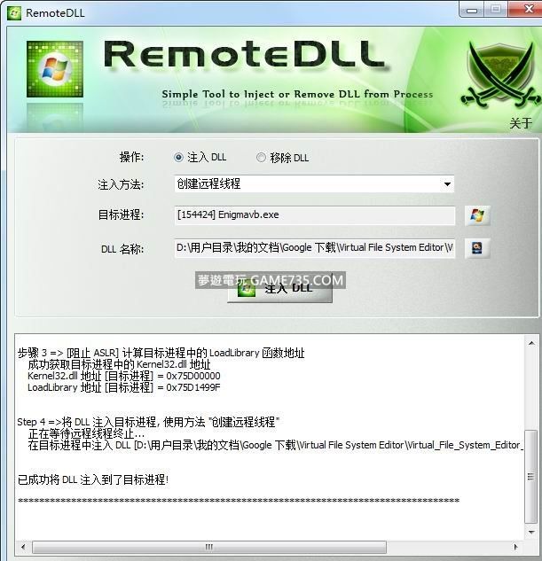 replyreload += ',' + 2111118;RemoteDLL 是一款簡單易用的從遠程進程中註入或移除 DLL 的強大工具。它是基於流行的 Dll 注入技術 它支持以下 DLL 注入方法: – 創建遠程線程 – 創建 NT 線程(適用於 Vista/Wi
