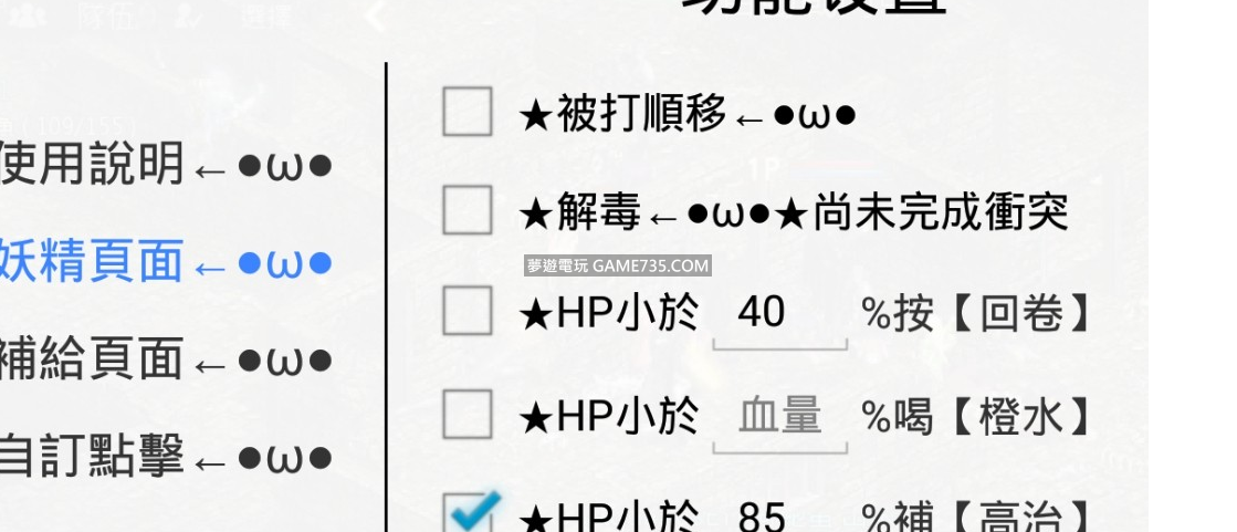 FB如下: https://www.facebook.com/profile.php?id=1000216448113651、★HP小於____%按【回卷】 2、★HP小於____%喝【橙水之類的】 3、★HP小於____%補【高治】 4、★HP大於____% & MP小於____%洗【魂體】 5、