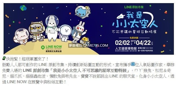 2018/2/3【免費貼圖上架】【台灣】 由六位原創貼圖創作者以太空主題為概念發想的全新限定創作,只要到展覽現場,就有機會透過開啟藍牙參與LINE NOW服務獲得限量貼圖。活動期限:2018/04/22。 快抱緊!超萌