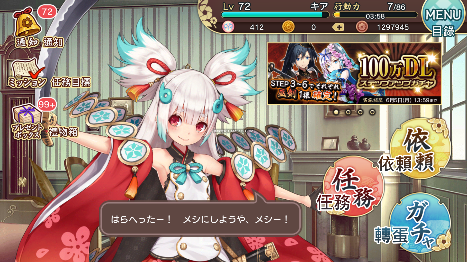 遊戲名稱 : ( 中文名 ) 天華百劍-斬 ( 日文名 ) 天華百剣 -斬- 遊戲語言 : 日文 遊戲版本 : V4.25 +台版 V1.12.10 手機權限 : Non Root 手機系統 : Android 任何修改過的遊戲都有被鎖的機率,所以下載前請三思