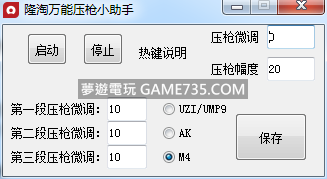 replyreload += ',' + 2127274; 1:新增槍械配置一鍵切換。 2:新增保存微調數值。 3:新增熱鍵說明。 啟動F1 停止F2 UZI:F3 AK:F4 M4:F5 按F1啟動以後,然後按住滑鼠左鍵不放即可。 下載 所有站內附件皆