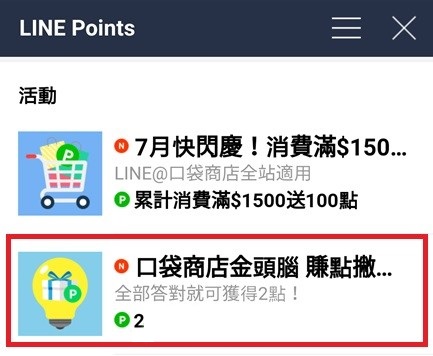 2018/7/17 Li ne Points免費代幣 2點+金頭腦 答案 口袋商店金頭腦 賺點撇步第4彈 答案 活動期間:2018/7/17 AM10:00~2018/7/23 AM10:00 (為期6天)。 Q1.全站消費滿1500送100點(3) Q2.快閃強打(2) Q3.名店(4)