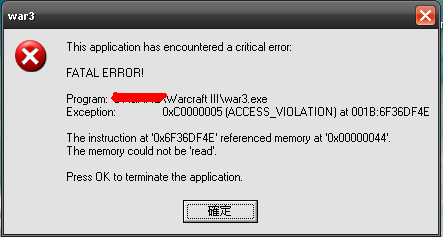 本帖最後由 g45gcd4e 於 2011-2-26 20:16 編輯 剛剛信長打到一半 竟然彈跳出錯誤視窗 !!! 當然遊戲 ( war3 ) 也跟著跳出 且直接關閉 ... 錯誤視窗: 看不出錯誤代碼錯誤在哪 -/- 該如何解決 ?! 重