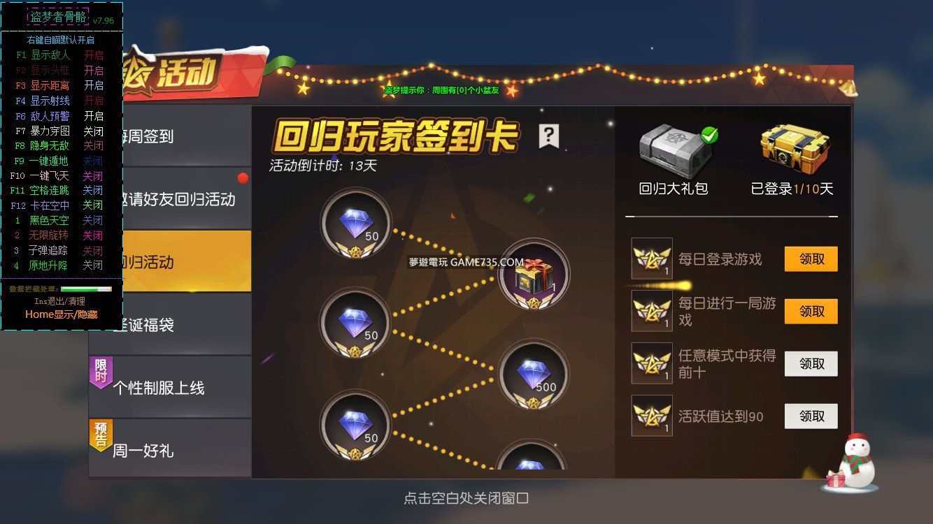 replyreload += ',' + 2161001; 輔助介紹:功能說明:右鍵自瞄 顯示敵人 顯示頭部 顯示距離 顯示射線 敵人預警 子彈穿圖 隱身無敵一鍵飛天 一鍵遁地 空格連跳 卡在空中 黑色天空 無限旋轉 子彈追蹤 原地升降使用
