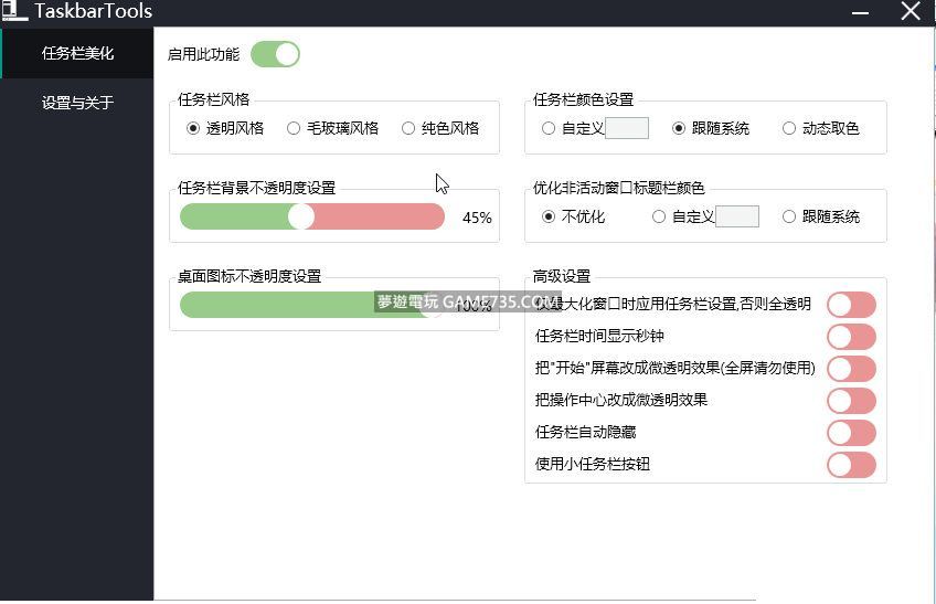 replyreload += ',' + 2166013; TaskbarTools是專門為Windows10系統準備的一款桌面狀態欄透明工具。該軟件小巧簡便,擁有透明、毛玻璃、純色三種風格選擇,支持透明度選擇,支持開機自動啟動,可以為用戶打造一個