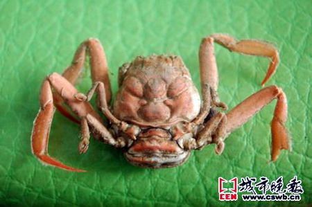 這只螃蟹被煮後,露出一“臉”怒容 遼源市民鐘女士的一只火柴盒大小的普通螃蟹,被煮過之後,整個身體竟呈現出人臉的模樣。 “這只小螃蟹差點就被吃了