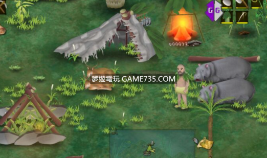 遊戲中有不少投擲類工具,石頭,竹叉,弓箭。有時候你會碰到一些獵物,如草原上的兔子,池塘裏的魚。你需要用你的投擲工具瞄准獵物進行獵殺,當然不同的獵物需要不同的投擲工具。