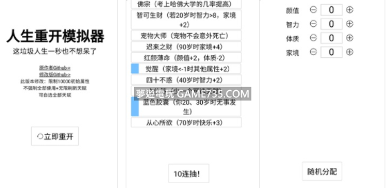 replyreload += ',' + 2279454;測試回報可能無法進入遊戲複製代碼移植遊戲,大量屬性點,天賦可一直刷新,可自選全部天賦。 註:該遊戲需要網絡才可正常運行。 遊戲簡介 人生重開模擬器天命之子版是一款十分精