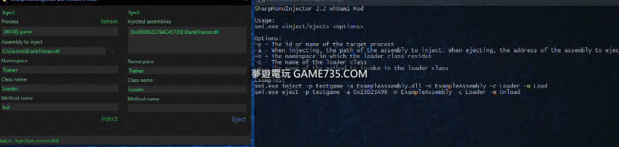 replyreload += ',' + 2281984;SharpMonoInjector是一款專門用於注入Unity Mono遊戲的注入器 . 使用方式 開啟遊戲,並啟動注入器 點擊Refresh刷新進程並選擇遊戲進程 選擇要注入的DLL 填寫Namespace、Class nam