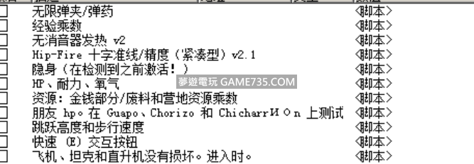 replyreload += ',' + 2282165; 無限彈藥 經驗等級 十字准心 隱身 無限血量-耐力-氧氣 無限金幣-材料-資源 跳躍高度 步行速度 如何使用這個作弊表? 1.安裝 Cheat Engine 2.雙擊.CT文件以打開它。 3.單擊作弊引