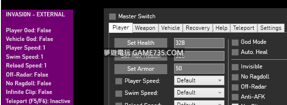 replyreload += ',' + 2287517;Invasi0n是一款GTA5幾年前的輔助,在硬碟塵封已久,最近挖出來修復。 功能 切換菜單|Insert 回復生命值+護甲|F1 移除通輯|F2 修復車輛|F3 傳送到途徑點 |F5 傳送到目標|F6 切換屏幕顯