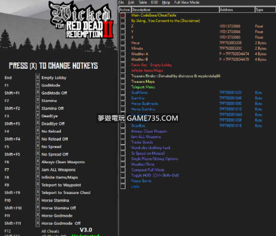 replyreload += ',' + 2287745; 在此處安裝 Cheat Engine 7.3 - https://www.cheatengine.org/ 在 Windowed Borderless 中啟動 RDR2 並加載到遊戲中 一旦你雙腳著地進入遊戲, 雙擊 WickedMenu.CT 打開 Wicked Me