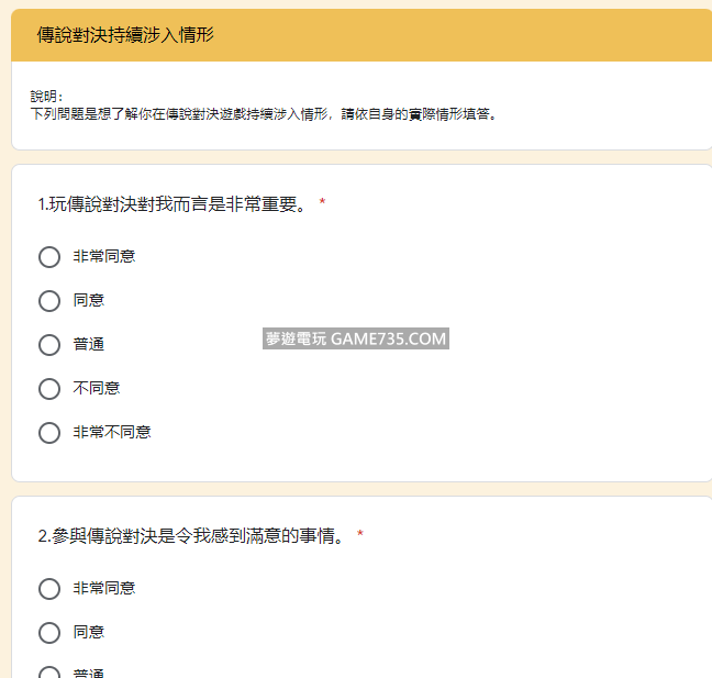 親愛的同學你好:很感謝你參與這份問卷。這份問卷是為探討傳說對決持續涉入的相關性,你的回答僅供學術研究之用,絕對保密並以數字分析,不會呈現個人資料,請依照實際狀況回答。 填答對象:目前正在玩傳說對決的「國小五六年級、國中生和高中職生」,填答時間約5-10分鐘。 問卷截止後,將從「有效問卷」中抽取二十名填答者贈送100元全家或7-11禮券。 祝 學業進步 平安喜樂 大葉大學休閒管理事業研究所 問卷網址:https://forms.gle/rTPduXexNTseJn3D9