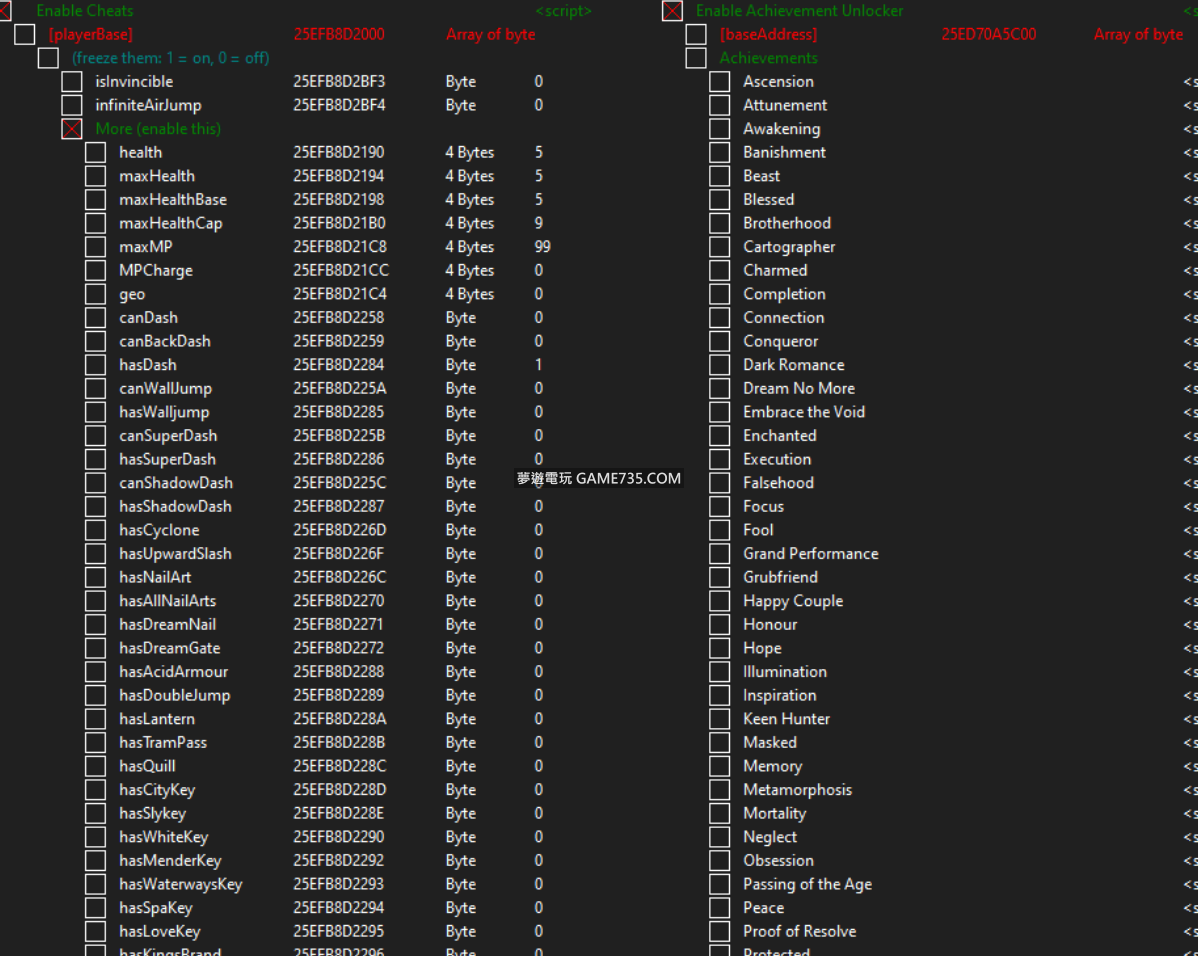replyreload += ',' + 2290712;使用方法。 1. 目標進程。Hollow Knight.exe 2. 在遊戲中控制你的角色時,勾選 "啟用作弊器 "旁邊的方框。 3. 3. 按你認為合適的方式編輯數值。有些數值需要0/1的關閉/開啟 4. 對於成