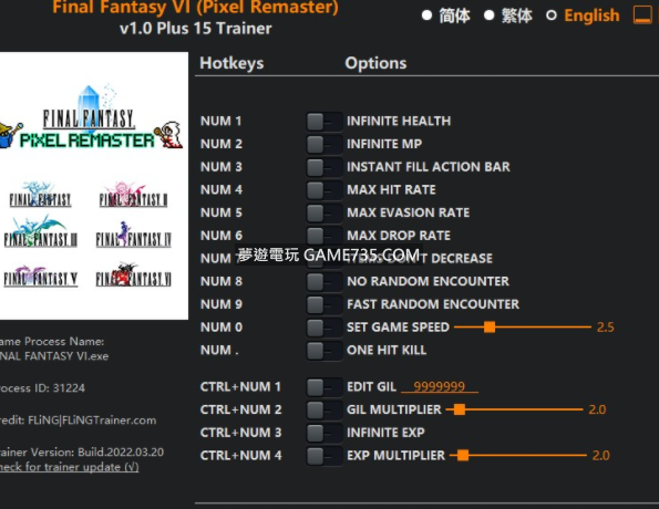 replyreload += ',' + 2292139;《FINAL FANTASY VI》像素複刻版 數字鍵 1 – 無限健康 數字鍵 2 – 無限 MP 數字鍵 3 - 即時填充操作欄 數字鍵 4 – 最大命中率 數字鍵 5 – 最大迴避率 數字鍵 6 – 最大掉落率