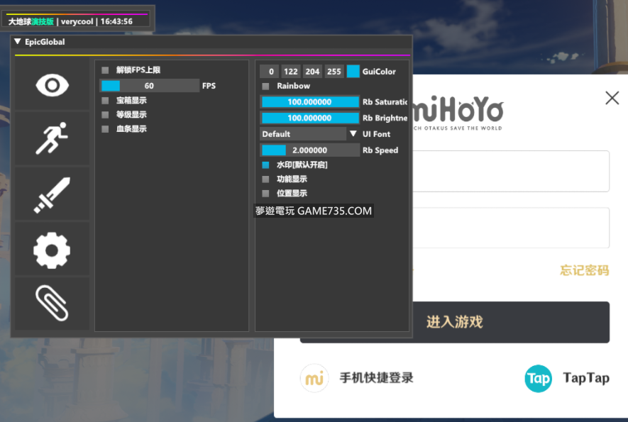 replyreload += ',' + 2293049; ---使用方法--- 進入遊戲後管理員運行本程序 通過注入器來引導遊戲啟動 ---更新日誌--- [V15-7] 新增功能: 元素視野[合法選項] 修復 MainAllocRAM 有概率閃退的問題 調整 Conso