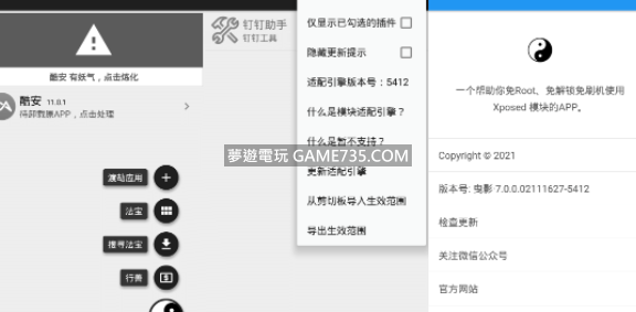 replyreload += ',' + 2294327; 太極是一個無需Root、不用解鎖Bootloader,也不需要刷機就能使用 Xposed 模塊的一個APP。太極擁有無需刷機、無需解鎖、使用簡單的優點,支持目前大部分xposed模塊,支持安卓5.0-11