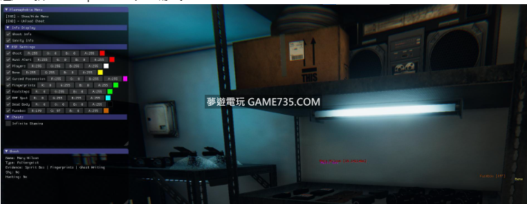 replyreload += ',' + 2294810; 功能 幽靈名子 幽靈類型 模擬類型 證據 正在獵殺 平均理智 你的理智 其他玩家理智 幽靈透視 獵殺警報(在屏幕頂部和底部顯示大紅色文本) 玩家透視(顯示理智等級) 骨頭透視(DNA