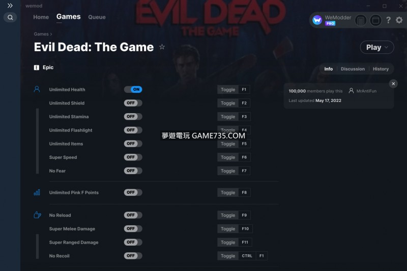 replyreload += ',' + 2295988; 選項: 1. 無限健康 2.無限護盾 3. 無限體力 4.無限手電筒 5. 無限物品 6.超高速 7. 無所畏懼 8. 無限粉紅F點數 9. 無需重新加載 10. 超級近戰傷害 11. 超遠程傷害 12