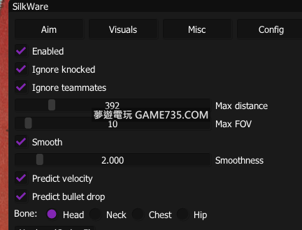 replyreload += ',' + 2297234; 特點 目標 - 忽略被擊倒 - 忽略隊友 - 最大距離 - 最大 FOV - 平滑 - 預測速度 - 預測子彈下落 - 骨骼選擇 - 關鍵 視覺效果 - 框 - 頭部點 - 健康欄 - 最大距離