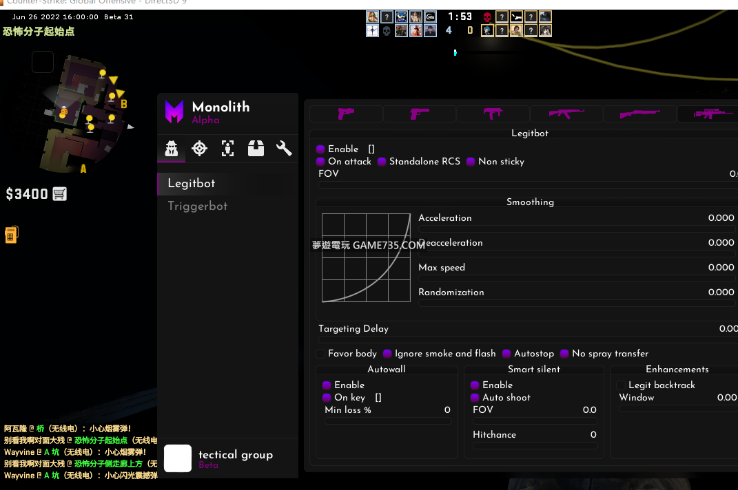 replyreload += ',' + 2298798; 使用說明: 1、將Monolith文件夾放到C盤 2、運行Steam 3、將steam_module.dll注入到Steam.exe 4、運行CS:GO 5、將cheat.dll注入到csgo.exe 所有站內附件皆會附上安全掃描報