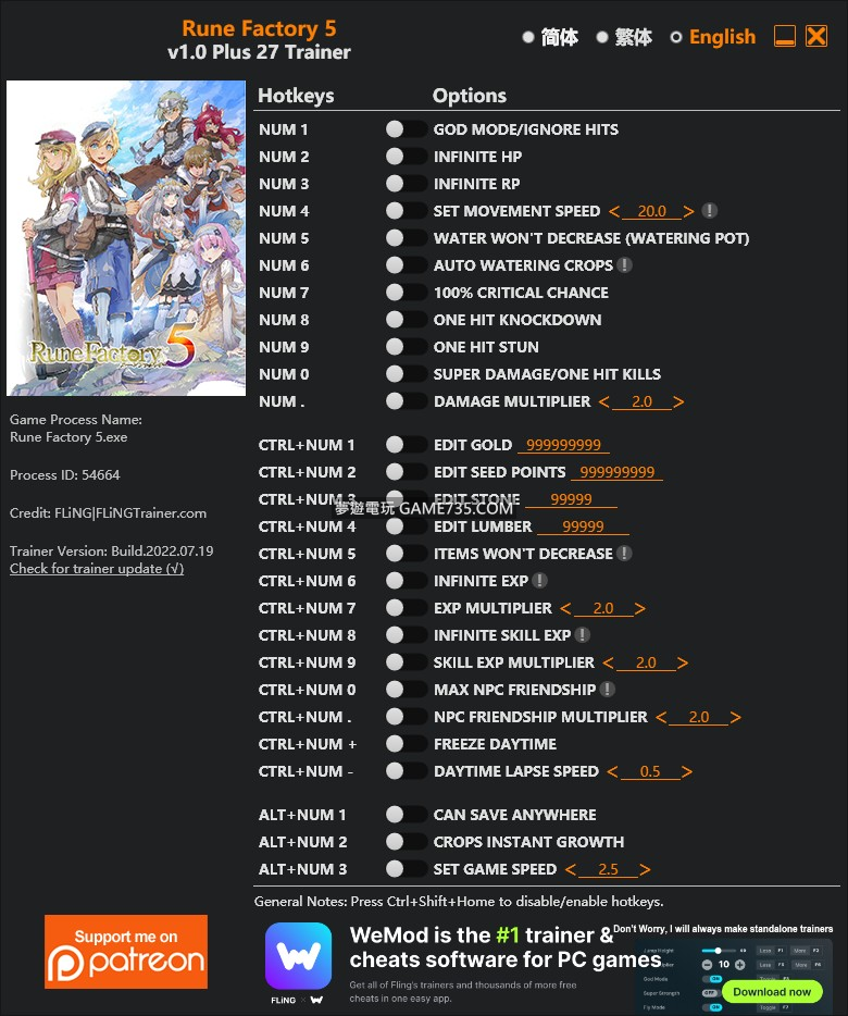 replyreload += ',' + 2300287; 選項 數字鍵 1 - 上帝模式/忽略命中 數字鍵 2 - 無限生命值 數字鍵 3 - 無限 RP 數字鍵 4 - 設置移動速度 數字鍵 5 - 水不會減少(水壺) 數字鍵 6 - 自動澆水 數字鍵 7 - 100%