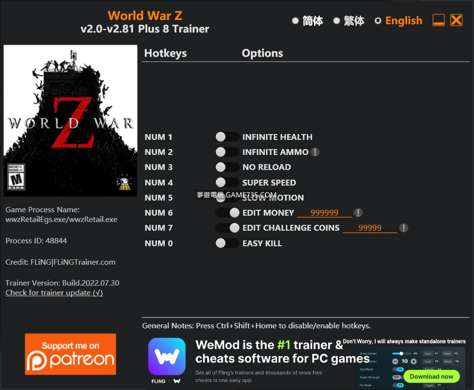replyreload += ',' + 2301006; 選項 數字鍵 1 - 無限生命 數字鍵 2 - 無限彈藥 數字鍵 3 - 不重新加載 數字鍵 4 - 超級速度 數字鍵 5 - 慢動作 數字鍵 6 - 編輯金錢 數字鍵 7 - 編輯挑戰幣 數字鍵 0 - 輕鬆殺死