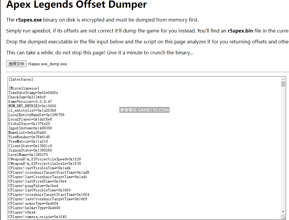 replyreload += ',' + 2301011;在discord上下載的 使用方法:注入到遊戲,怎麼注入自己想 Dumper完成後,會在遊戲目錄生成個 r5apex.exe_dump.exe的文件 https://casualhacks.net/apexstuff/apexdumper.html 所