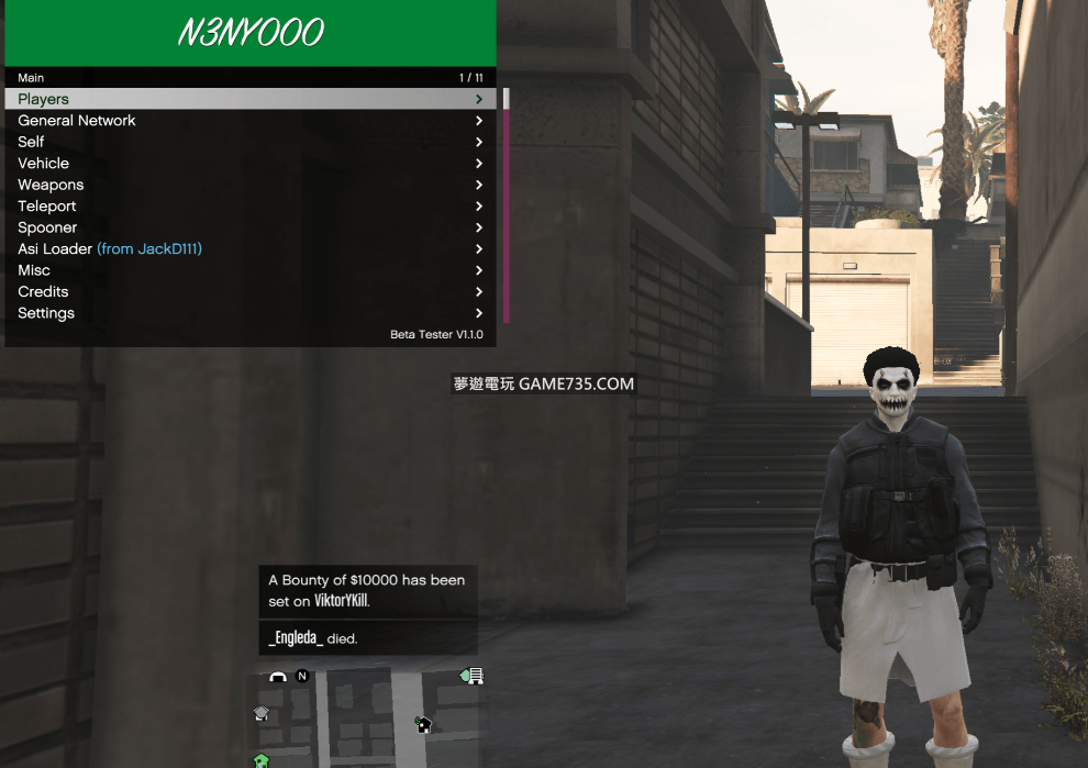 replyreload += ',' + 2301561; 使用方法 將N3NY000文件夾放置在文檔目錄 將ScriptHookV.dll復制到GTA根目錄 運行遊戲直至看到腳色人物後管理員運行Nenyooo Injector by subversion.exe 快捷鍵 F4 = 隱藏/顯示 菜