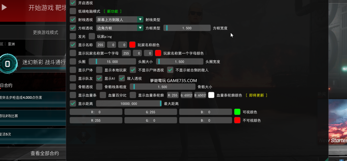replyreload += ',' + 2301720; 功能: 透視選項->方框透視、射線透視、距離透視、骨骼透視、血量透視、發光 自瞄選項->自定義自瞄范圍、自定義自瞄按鍵、自定義自瞄平滑、顯示自瞄范圍 超人選項->自動扳機、無