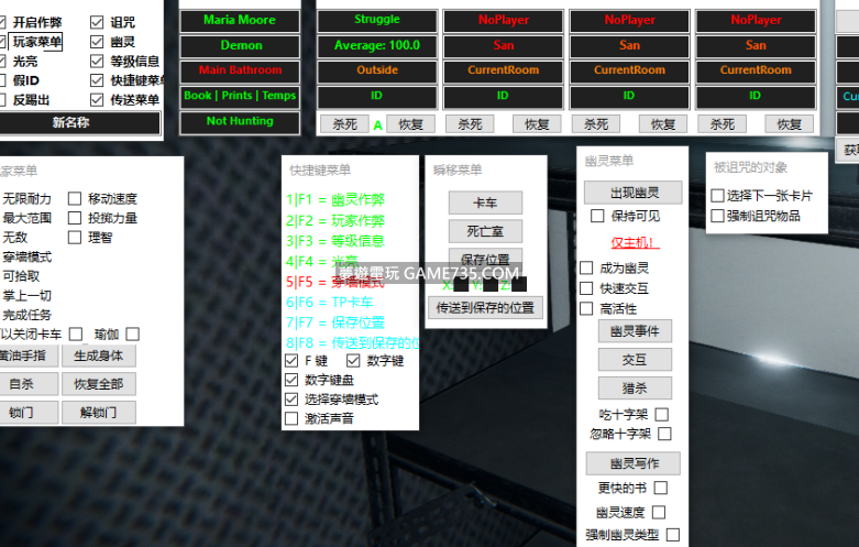 replyreload += ',' + 2307028; 支援版本:0.7.1.5 功能: 新名稱-修改玩家名字 無限耐力 移動速度修改 最大範圍 投擲力量 無敵 理智值修改 穿牆模式 等級資訊(顯示幽靈資訊 和 玩家資訊) 幽靈資訊(幽靈名稱