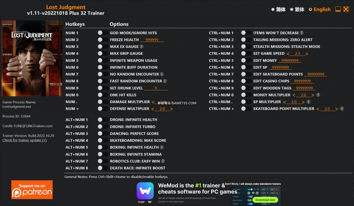 replyreload += ',' + 2307200; 選項 數字鍵 1 - 上帝模式/忽略命中 數字鍵 2 - 凍結健康 數字鍵 3 - 最大 EX 量規 數字鍵 4 - 最大握力計 數字鍵 5 - 無限武器使用 數字鍵 6 - 無限增益持續時間 數字鍵 7 - 沒